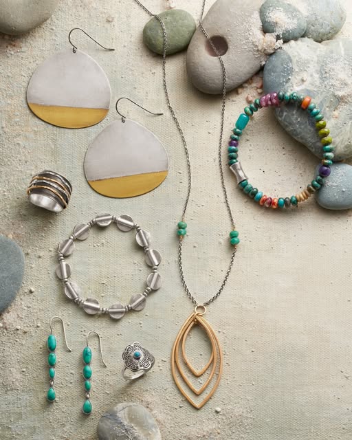 Gemstone Jewelry: Necklaces, rings, and bracelets featuring turquoise, moonstone, quartz, and other natural stones.
